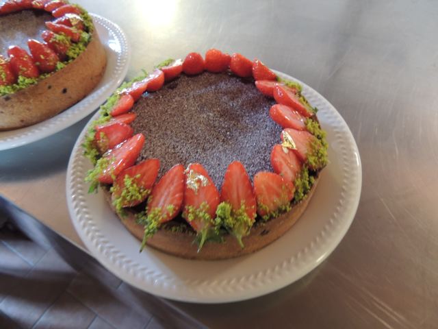 La torta completata e decorata con fragole fresche e fogli d'oro